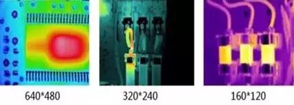 首先,要確定購(gòu)買紅外熱像儀的像素級(jí)別,大多紅外熱像儀的級(jí)別和像素有關(guān)。民用紅外熱像儀中相對(duì)高端的產(chǎn)品像素為640*480=307,200,此高端紅外熱像儀拍攝的紅外圖片清晰細(xì)膩,在12米處測(cè)量的最小尺寸是0.5*0.5cm;中端紅外熱像儀的像素為320*240=76,800,在12米處測(cè)量的最小尺寸是1*1cm;低端紅外熱像儀的像素為160*120=19,200,在12米處測(cè)量的最小尺寸是2*2cm。可見像素越高所能拍攝目標(biāo)的最小尺寸越小,下圖所示為三個(gè)級(jí)別像素紅外熱圖片的比較: